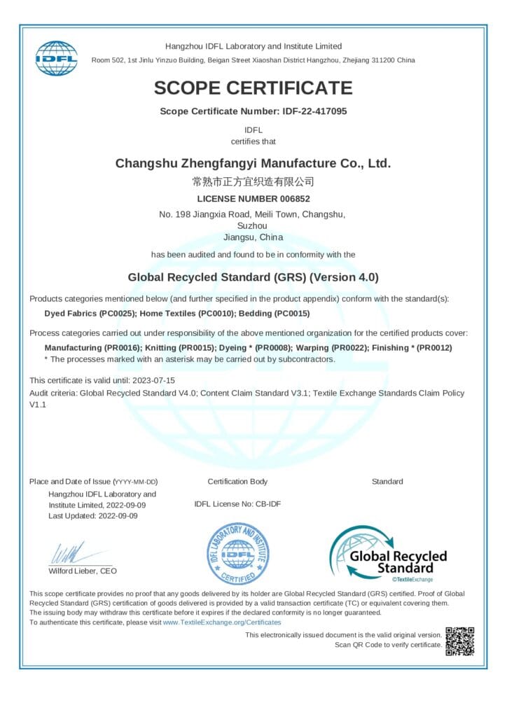 Why it matters: Validates that our recycled fabrics truly come from recycled sources and produced under strict social and environmental practices.