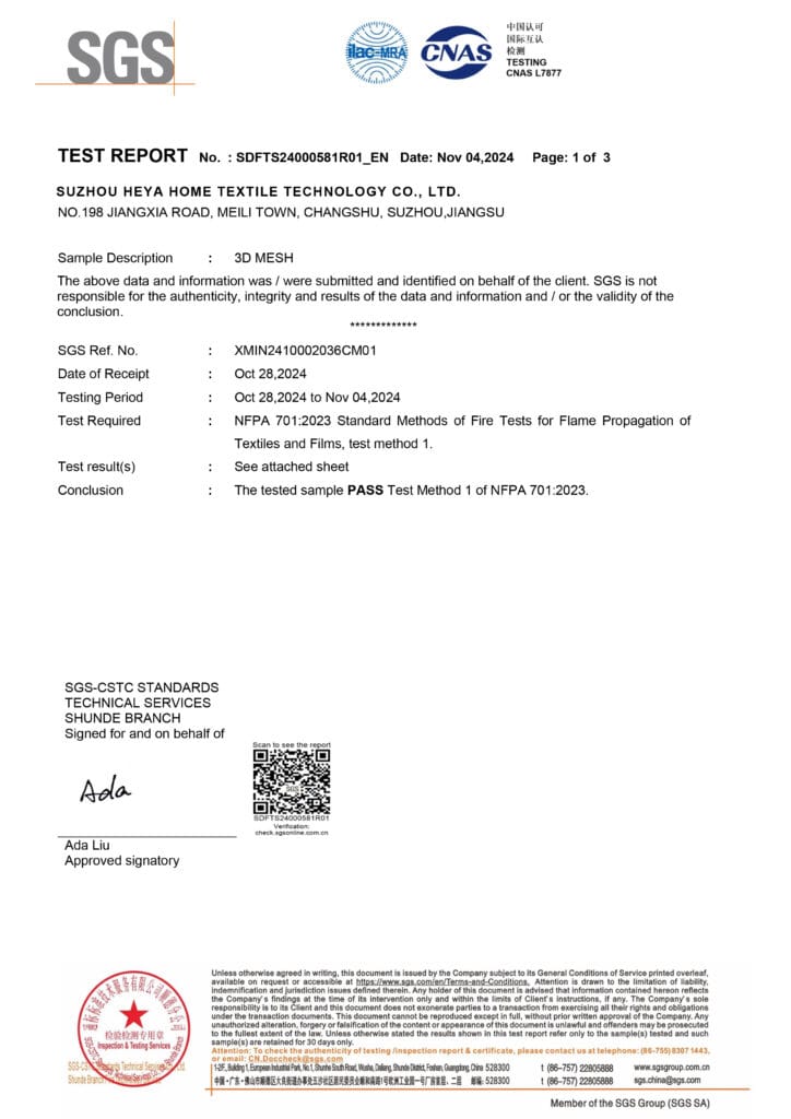 This report validates that our 3D MESH meets the strict flammability standards (NFPA 701) required for public spaces in the US and international markets. The material demonstrates self-extinguishing properties with low mass loss and no dripping, ensuring high safety standards for end-users.